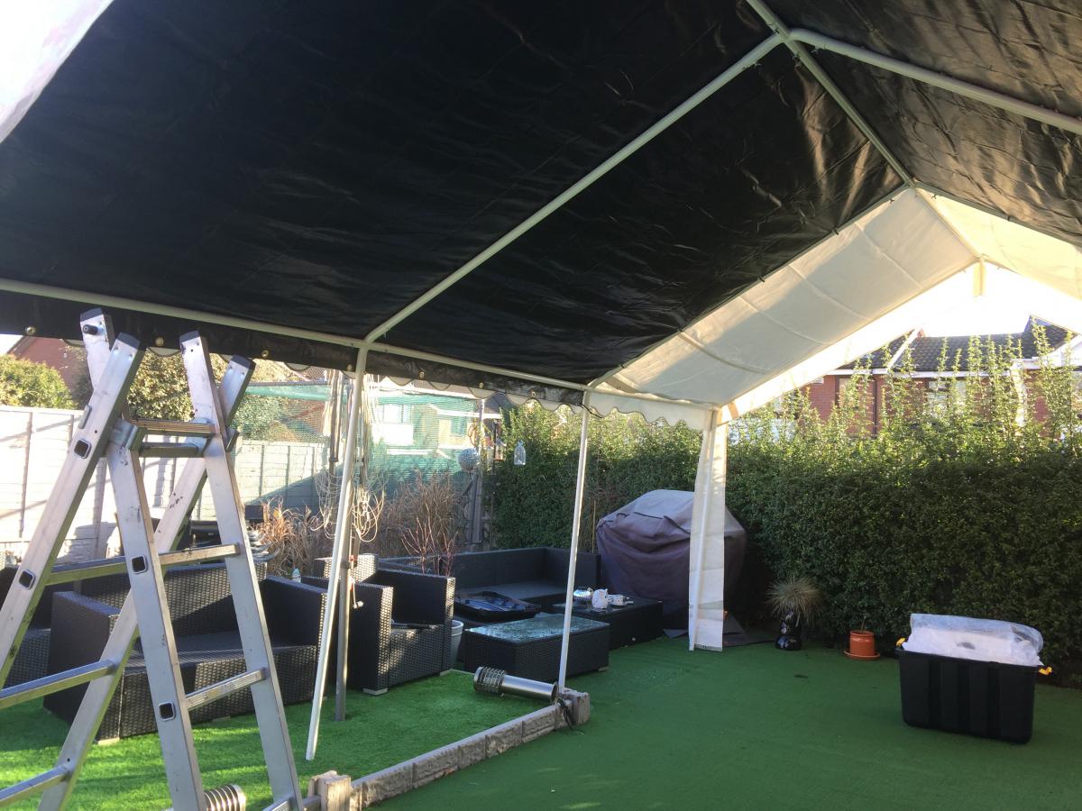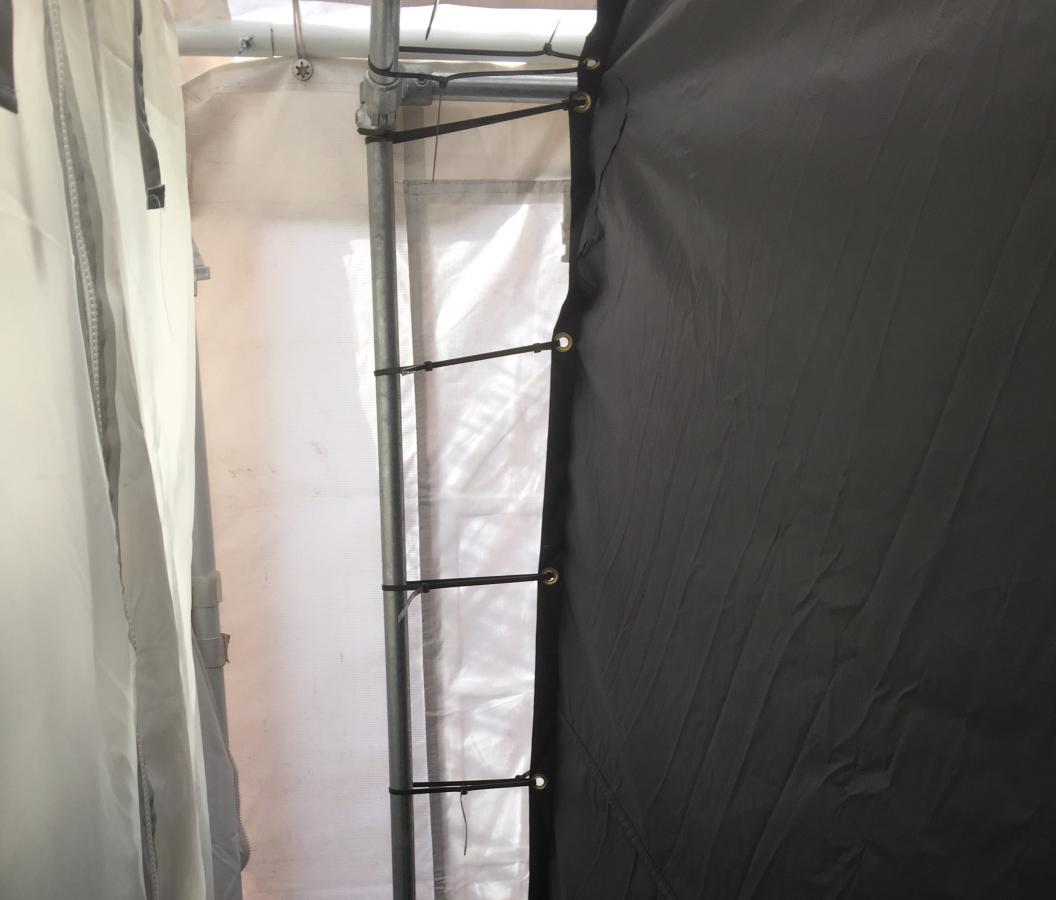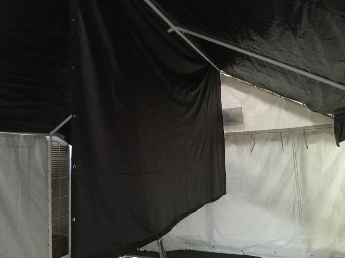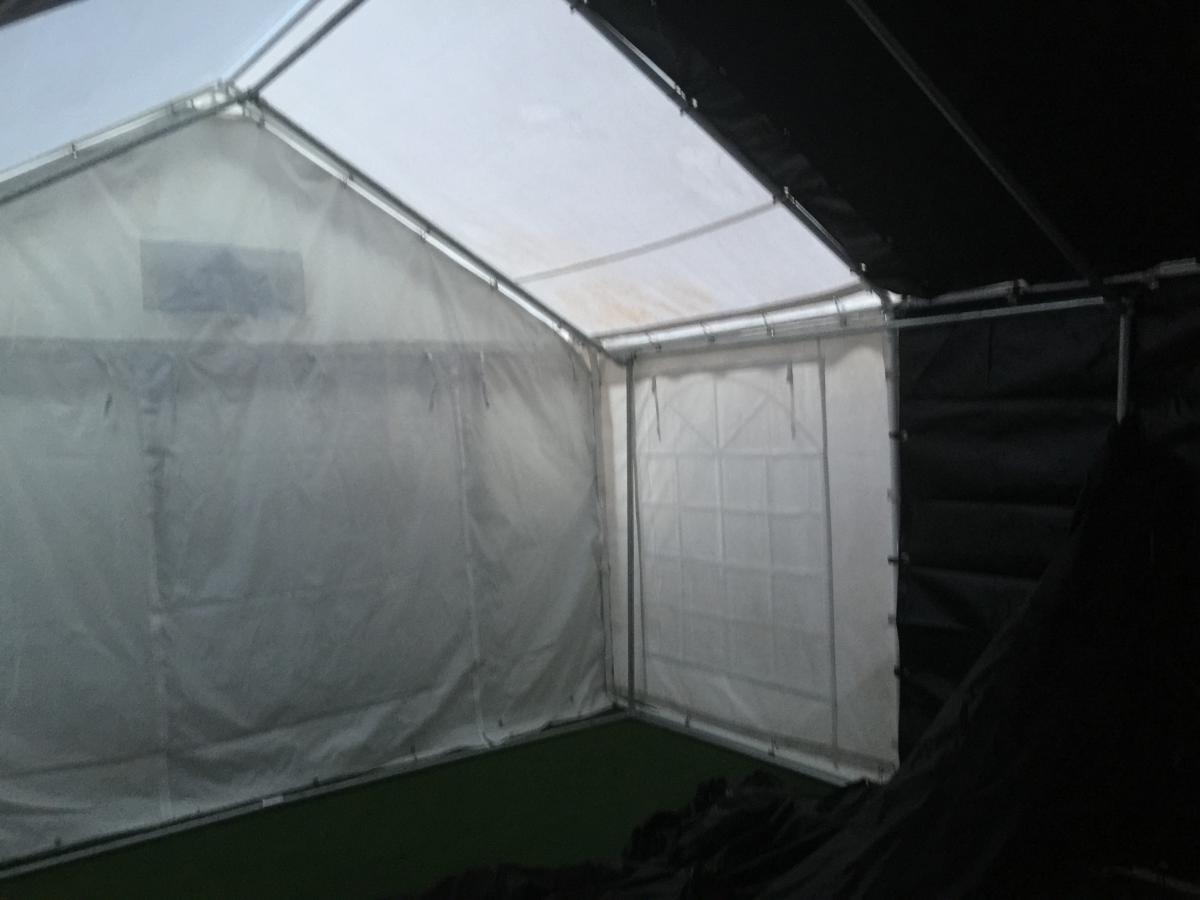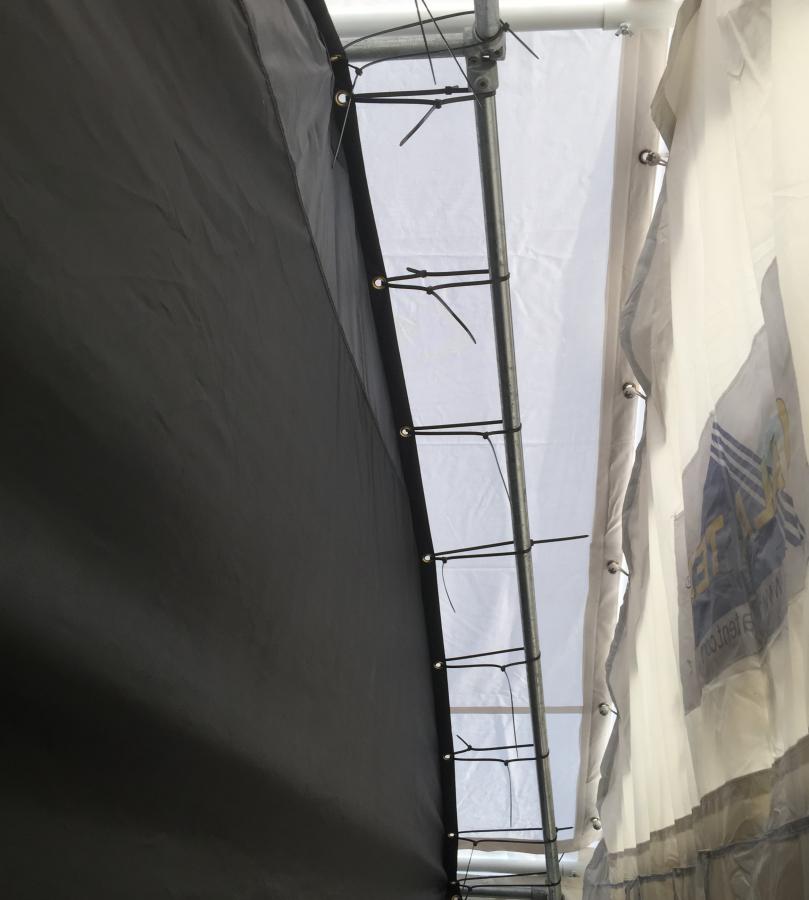 End wall & Side panels fastened in place before adding internal blackout material that I had made the previous year before myself, This hangs from the Centre roof pools (cable ties) hiding the white frame. Unfortunately in the daytime this seems to blead a little light in (purple tinge) which bugged me, hence the reason for the black tarpaulin. Also stops and condensation directly onto this material from the roof in colder weather.