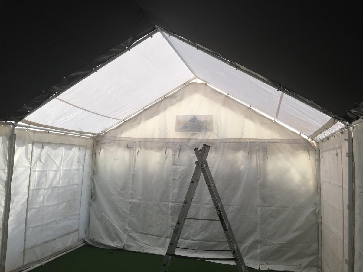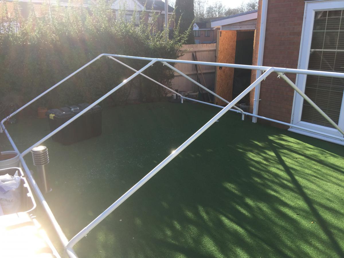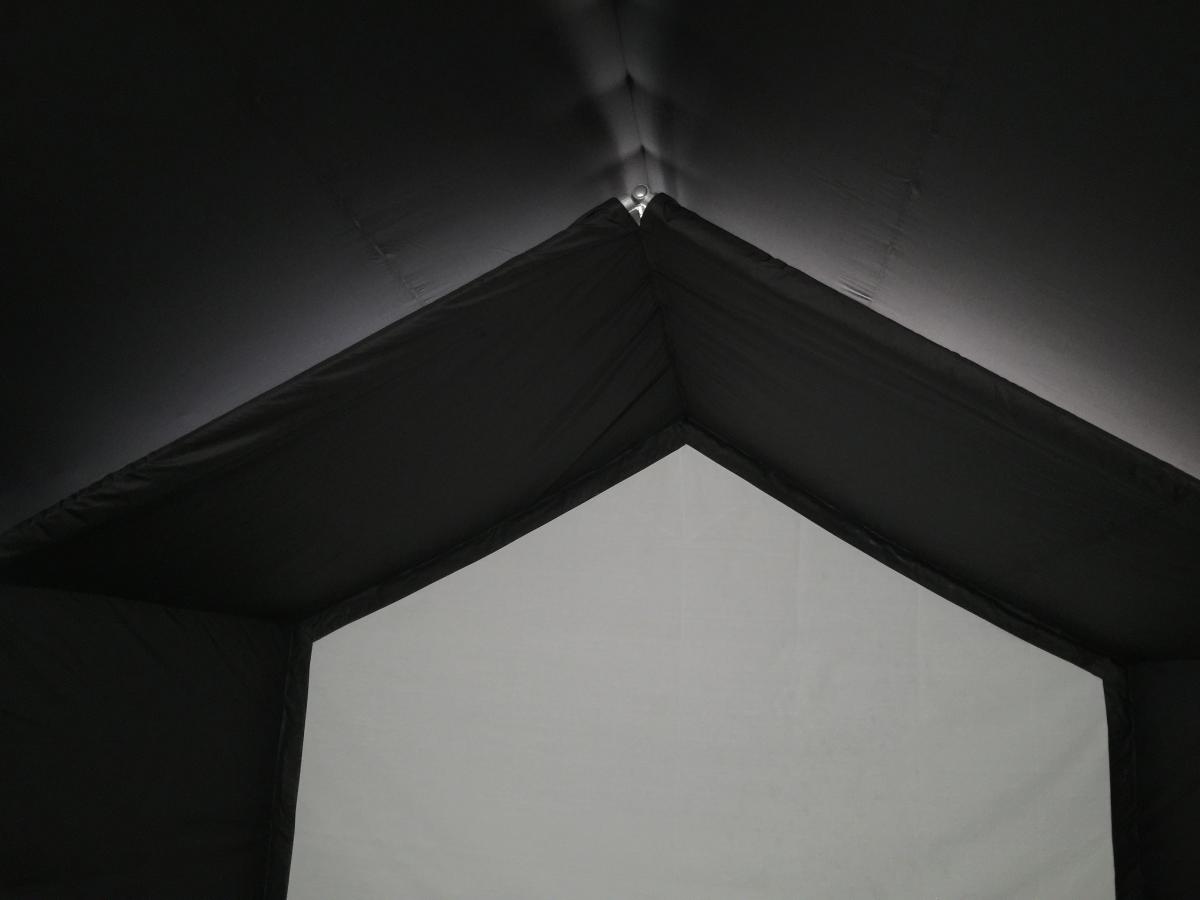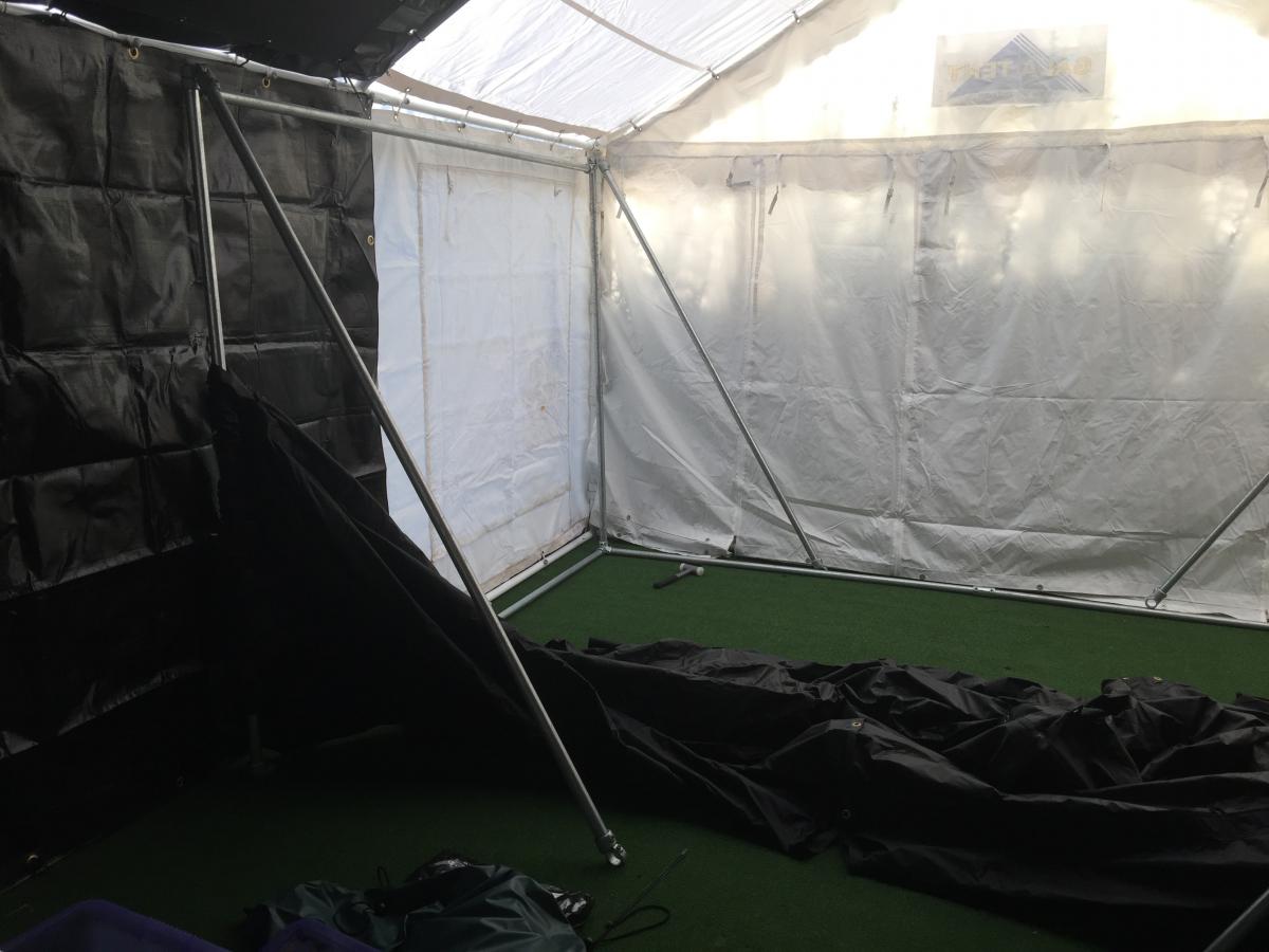 End wall & Side panels fastened in place before adding internal blackout material that I had made the previous year before myself, This hangs from the Centre roof pools (cable ties) hiding the white frame. Unfortunately in the daytime this seems to blead a little light in (purple tinge) which bugged me, hence the reason for the black tarpaulin. Also stops and condensation directly onto this material from the roof in colder weather.