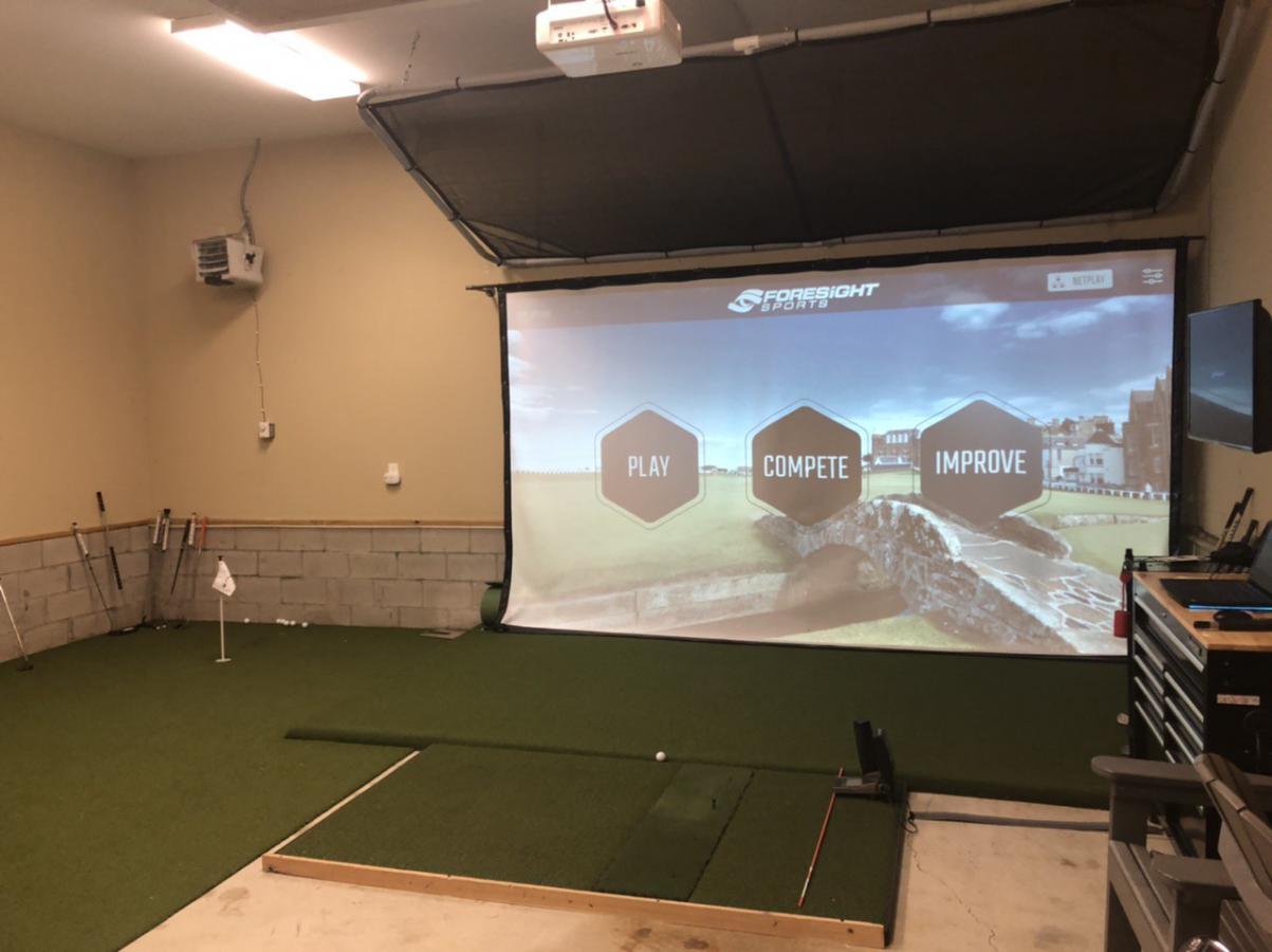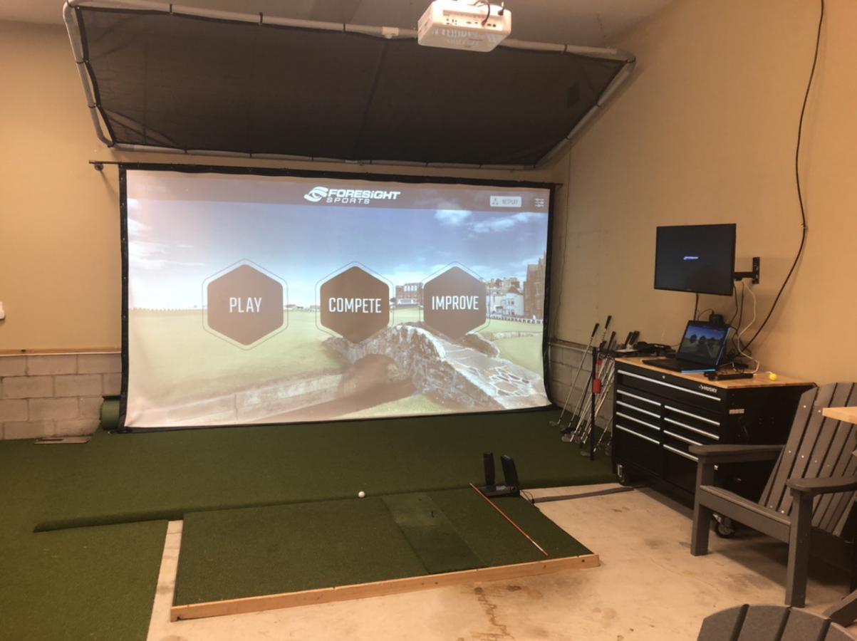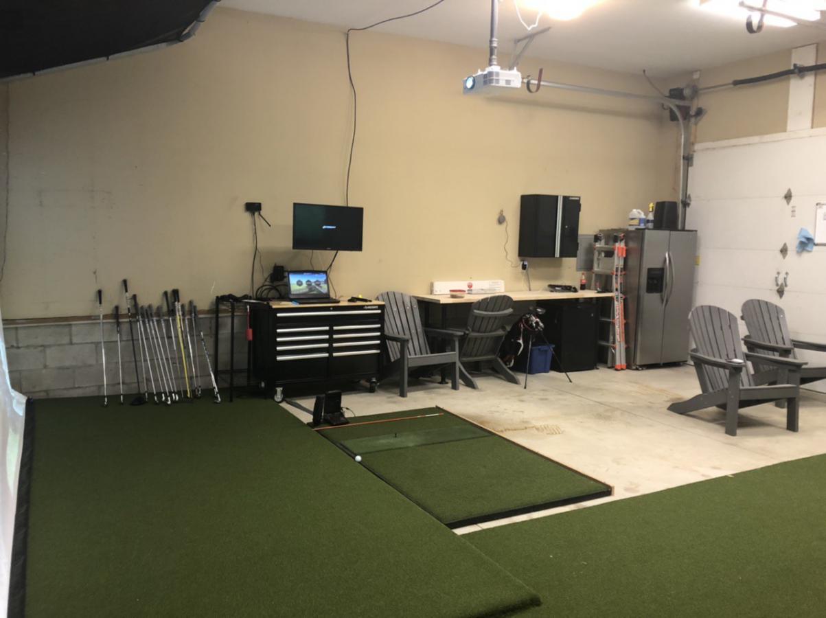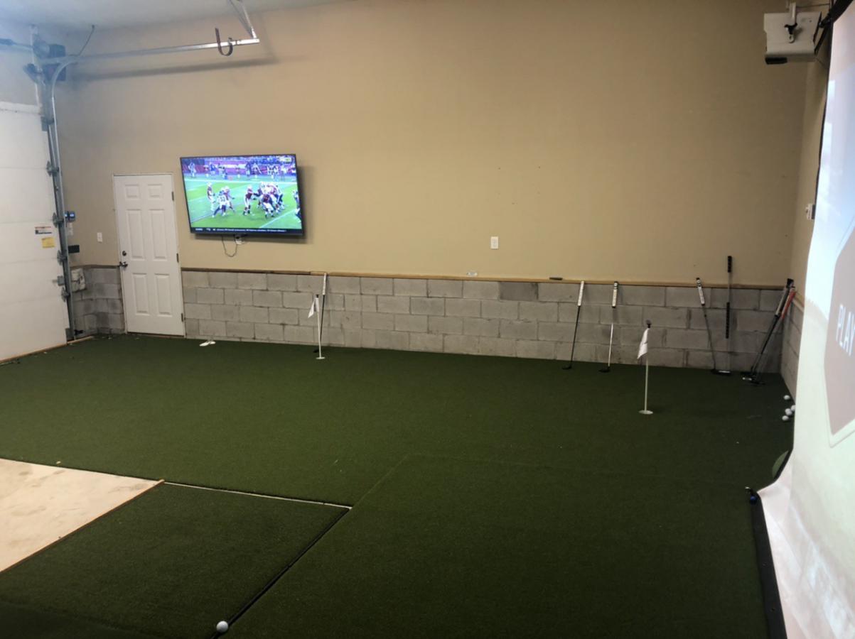 I’m running a GC2 with HMT, fiberbuilt mat that I’m going to add a gel pad section to, optima 4k550 projector, 15x8 screen, and I had SynLawn lay the putting green directly on the slab and bore the holes into it. Added a couple tv’s, the fridge from the kitchen remodel last year, and an electric space heater to keep things warm. The screen is hung by threaded black pipe and fittings screwed into the studs. I built the frame for the ceiling net from conduit, bungeed a mesh tarp from amazon and hung it from the ceiling with cables and eye lags. Finally I built a subfloor under the screen with some angle ripped 2x6’s and plywood that returns the ball back to me on the hitting mat.