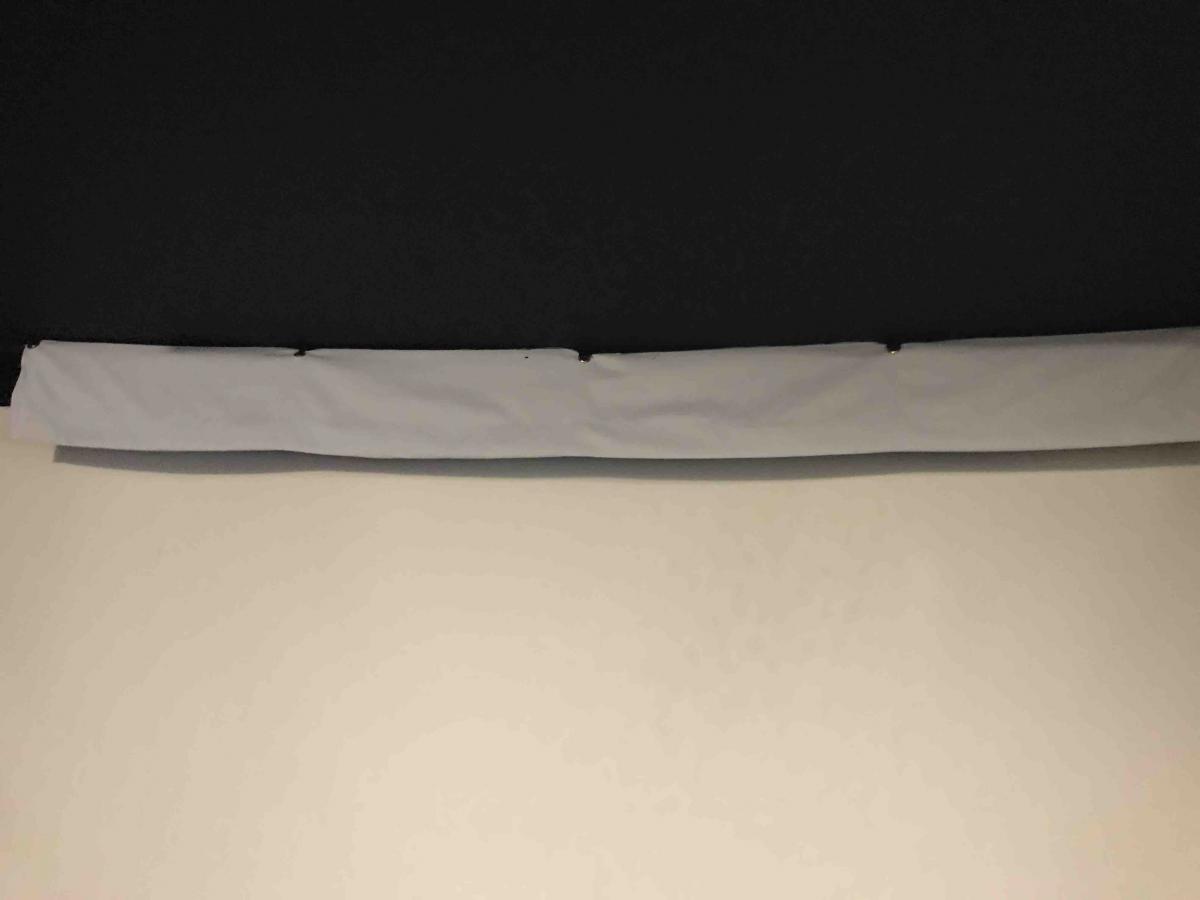 it can be cut w/ sharp scissors, and it went up w/ good spray glue. Not perfect, but there’s a lot less reflection of wedges from ceiling.1 Photo
