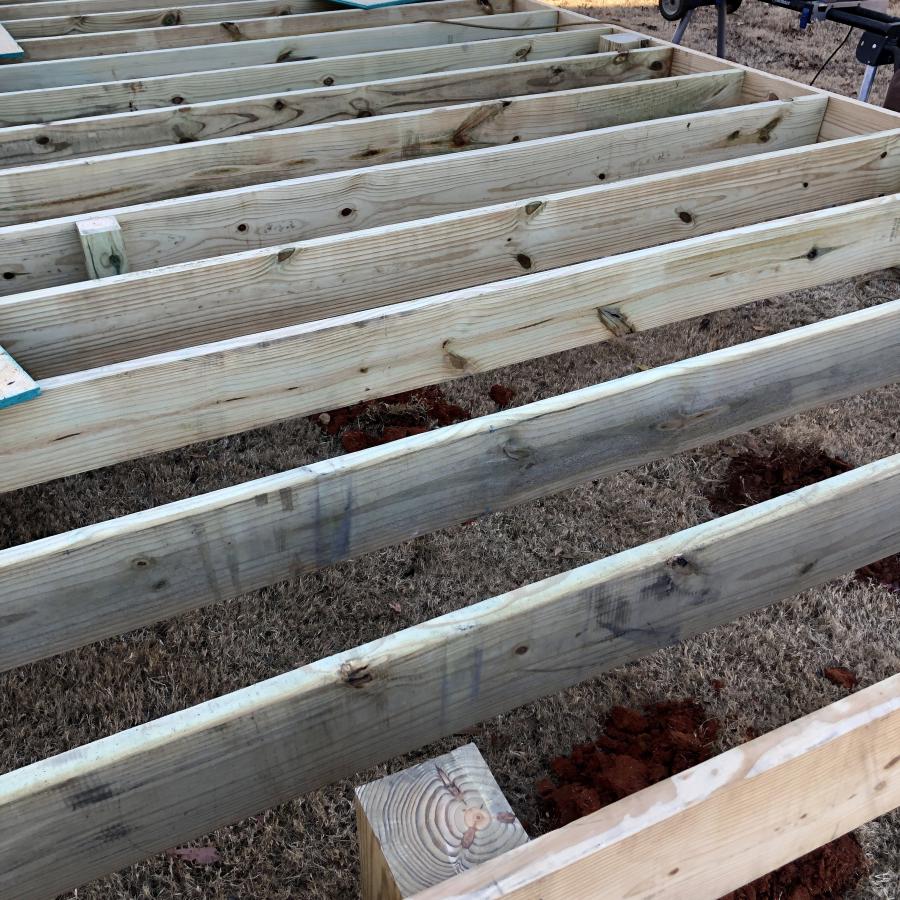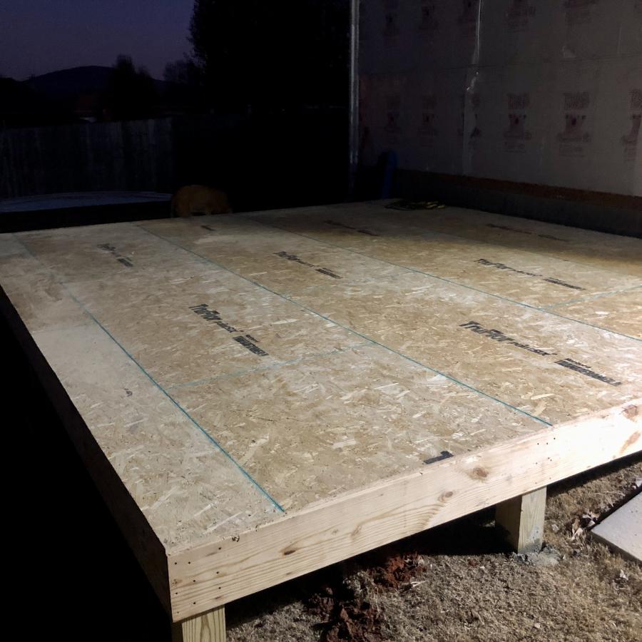 Got some more ground supports (6x6 on the perimeter and 4x4 in the middle) in today. 17’ joists are in. And the tongue and groove Tru floor is on. She’s taking shape. Walls go up tomorrow. Also have plastic moisture barrier and roll insulation going in the floor tomorrow. Hoping that will keep the cold/hot air away from the bottom of the floor. Progress! Click image for larger version