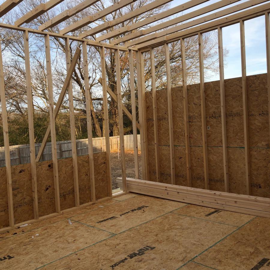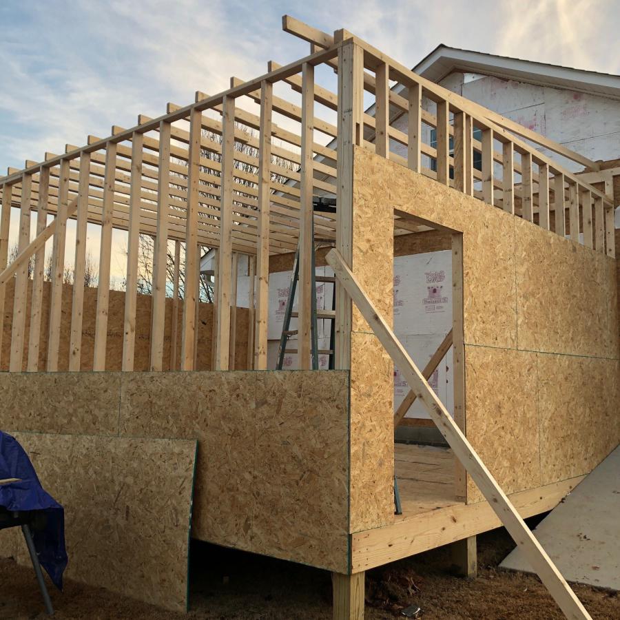 Weather here in North Alabama has caused some delays, but we finally have a little progress. Walls are up and about 30% of the ply is on the walls. Rafters and roof tomorrow.