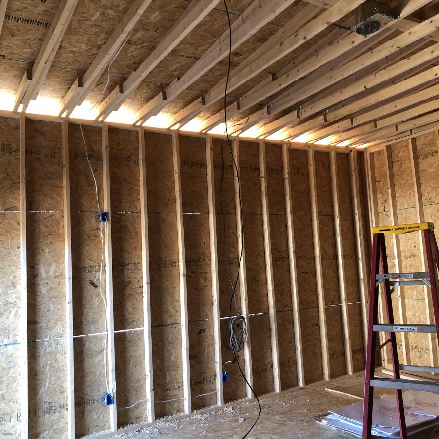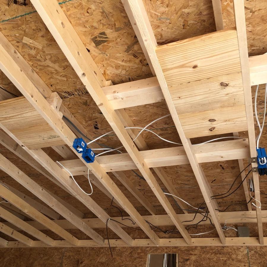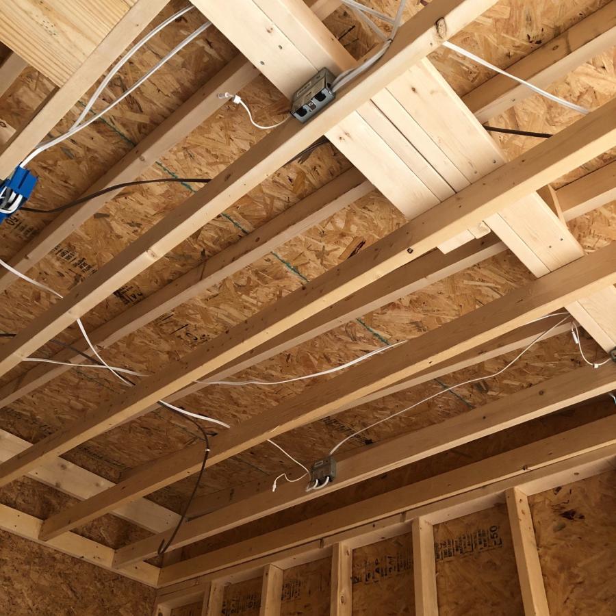 Build Update. Room is finally closed in. Still needs shingles and siding. But taking the day to pull in power and data. Mount boxes and figure out wiring runs for TV’s, Projector, Launch Monitor, Lights and Switches.