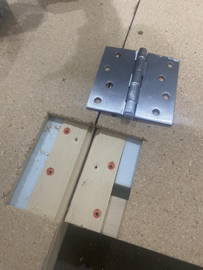 Next I marked out all the sections that needed to get cut to put the hinges flush with the subfloor panels (could have done this before attaching them to the frame). While the panels were off, I also routered out where the hinge was going to go to make sure it fit in there nicely then attached and secured the panels back on. VOILA, folding platform.