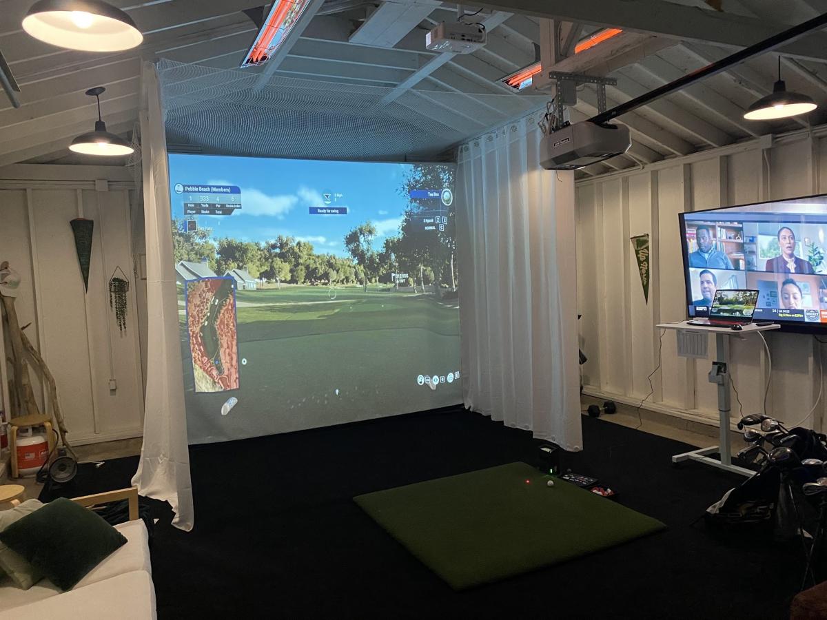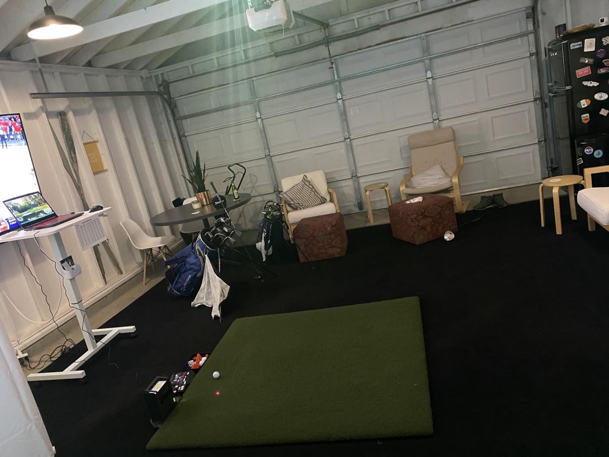 I completed my garage build here in Cleveland about two weeks ago and have absolutely loved playing! In truth, tinkering with the setup and researching how others have approached issues is almost as fun as playing. Prior to the golf simulator, we had remodeled the garage so it could be used as a 3 seasons hang-out space for our 3 boys. We had a shed built onto the back of the garage that you can access through barn doors. I always had the golf simulator in the back of my mind. We had to go with a retractable screen so that we could utilize the space for gatherings and other games when the boys had friends over (see picture without simulator below). We’ve given up on parking cars there (buy cheaper cars and spend the excess on a really fun garage)! Here are the details on the setup and some pictures.