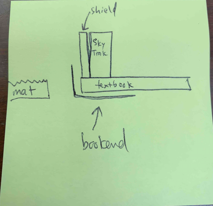 Here's a picture from when it was new. It's got a few more scratches now, but still works when aligned properly. May need to use a strap or something to attach it, though I used a single low-height bookend (such as a sample picture attached....make sure it's not too high to block the optical zone..or turn the bookend on its back so the height is lower on the Skytrak) to keep them together with a textbook that was the same height as my hitting mat.