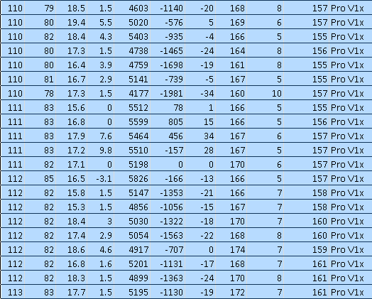 For example, this is my 7 iron chart. (The actual chart is longer than this.) The last number in each row is the distance I got from Flightscope Trajectory Optimizer. Since I am familiar with my numbers now, I don't refer to the chart every time I hit.